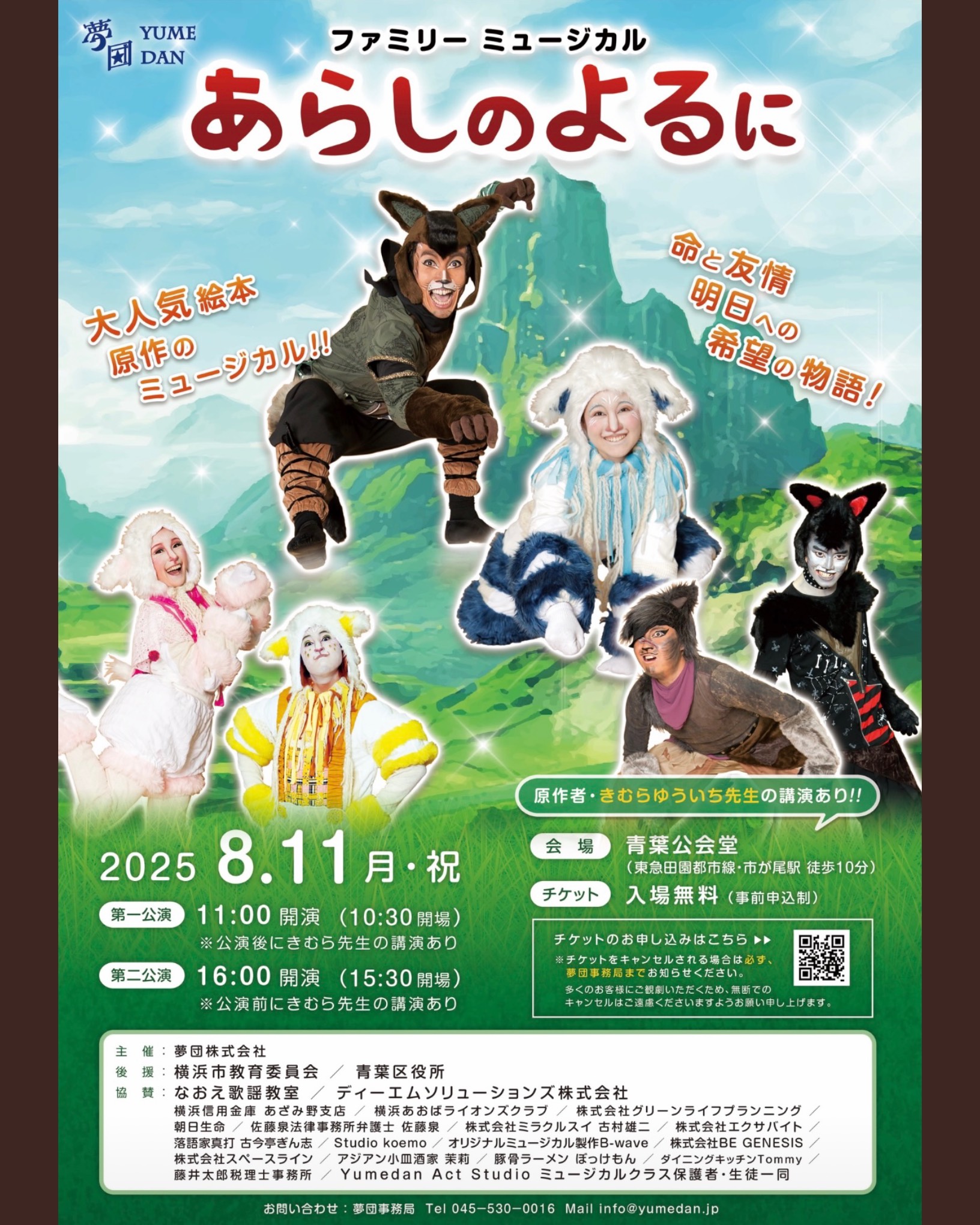 夢団 夏休みファミリーミュージカル『あらしのよるに』2025年8月11日(月・祝)①11:00開演 ②16:00開演 (開場は30分前です)青葉公会堂(東急田園都市線・市が尾駅徒歩10分)入場無料!!※事前申込制 (...